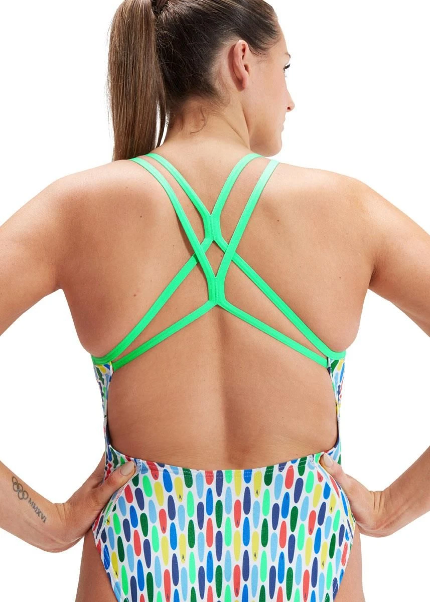 Catch a break during tough training sessions wearing Speedos colourful surfboard print Starback swimsuit. This stunning swimsuit features a high leg cut and starback straps for maximum freedom of movement, so you can power through your sets in style and comfort. Fully lined in ammonite blue for comfort and modesty. Designed to be durable and better for the environment, it’s made from Speedos ECO Endurance+ Fabric, which is 100% chlorine resistant, quick-drying and made using 50% recycled materials.