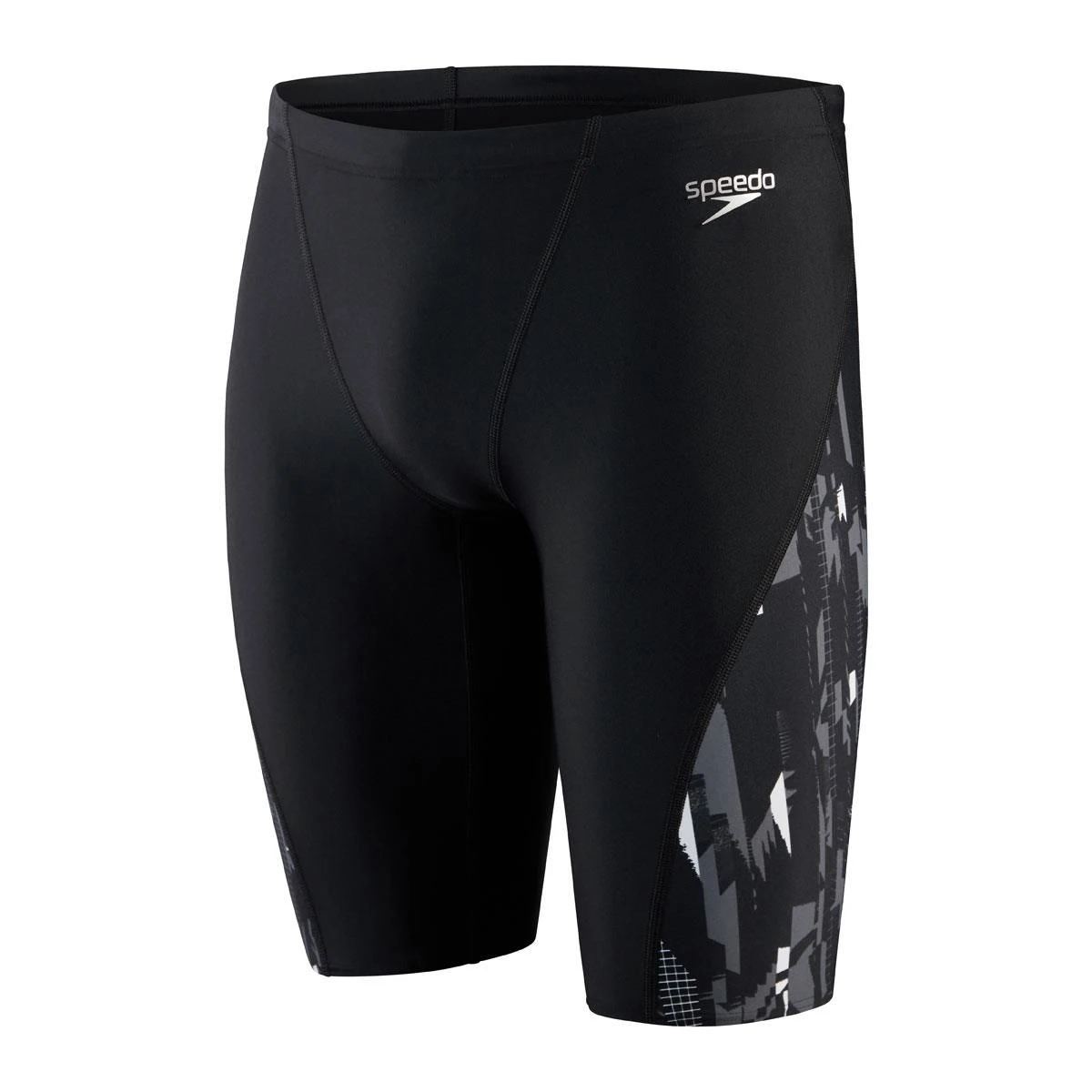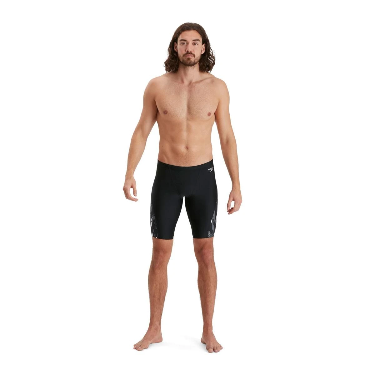 Look sharp as you glide through every stroke wearing this sleek-looking Speedo jammer, featuring a monochrome ‘glitch’-effect side panel print.