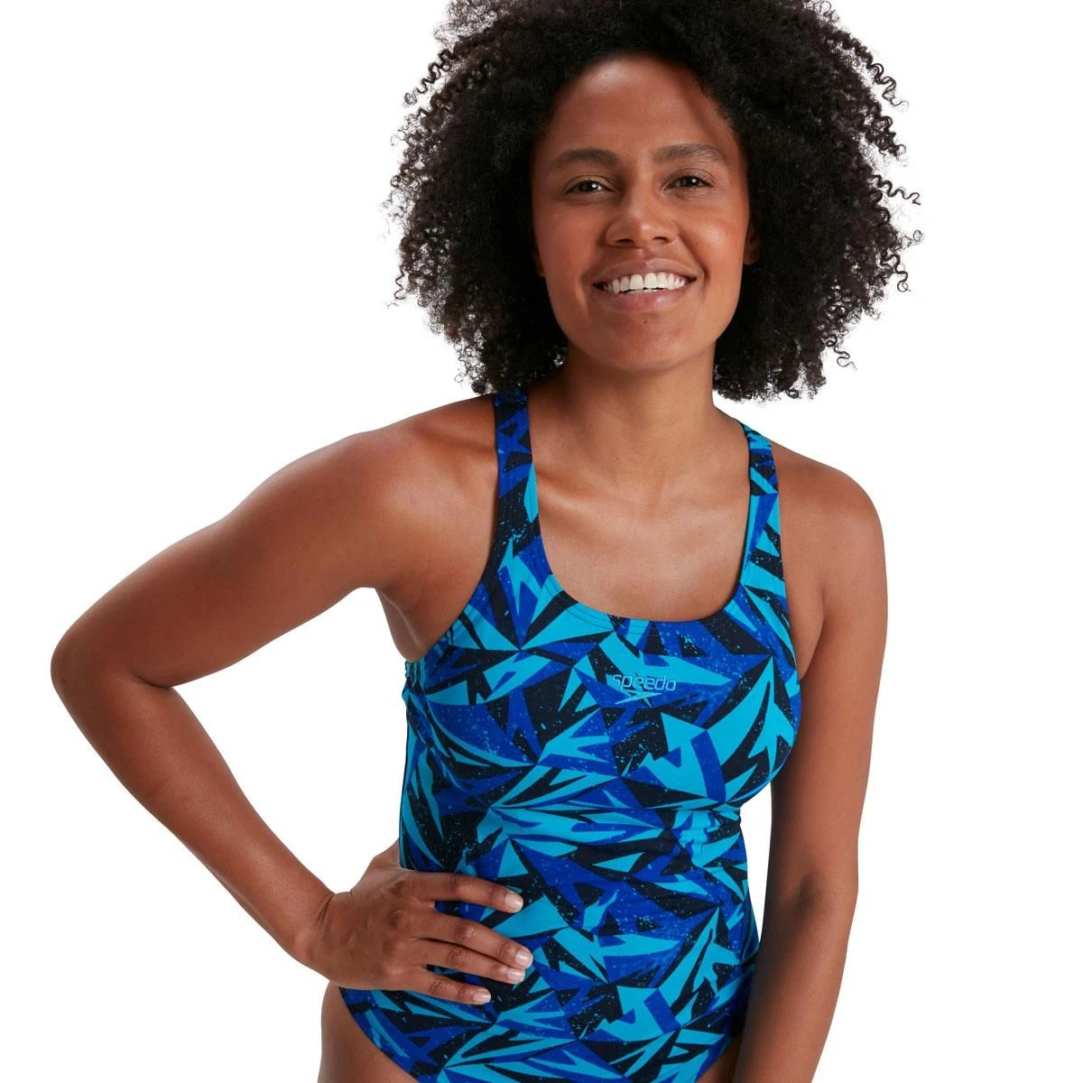 This Speedo swimsuit showcases an iconic Boom logo print in a beautiful blue and navy.