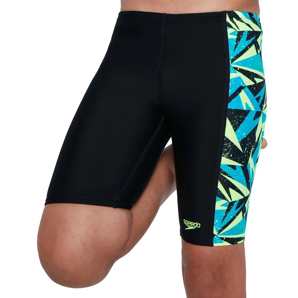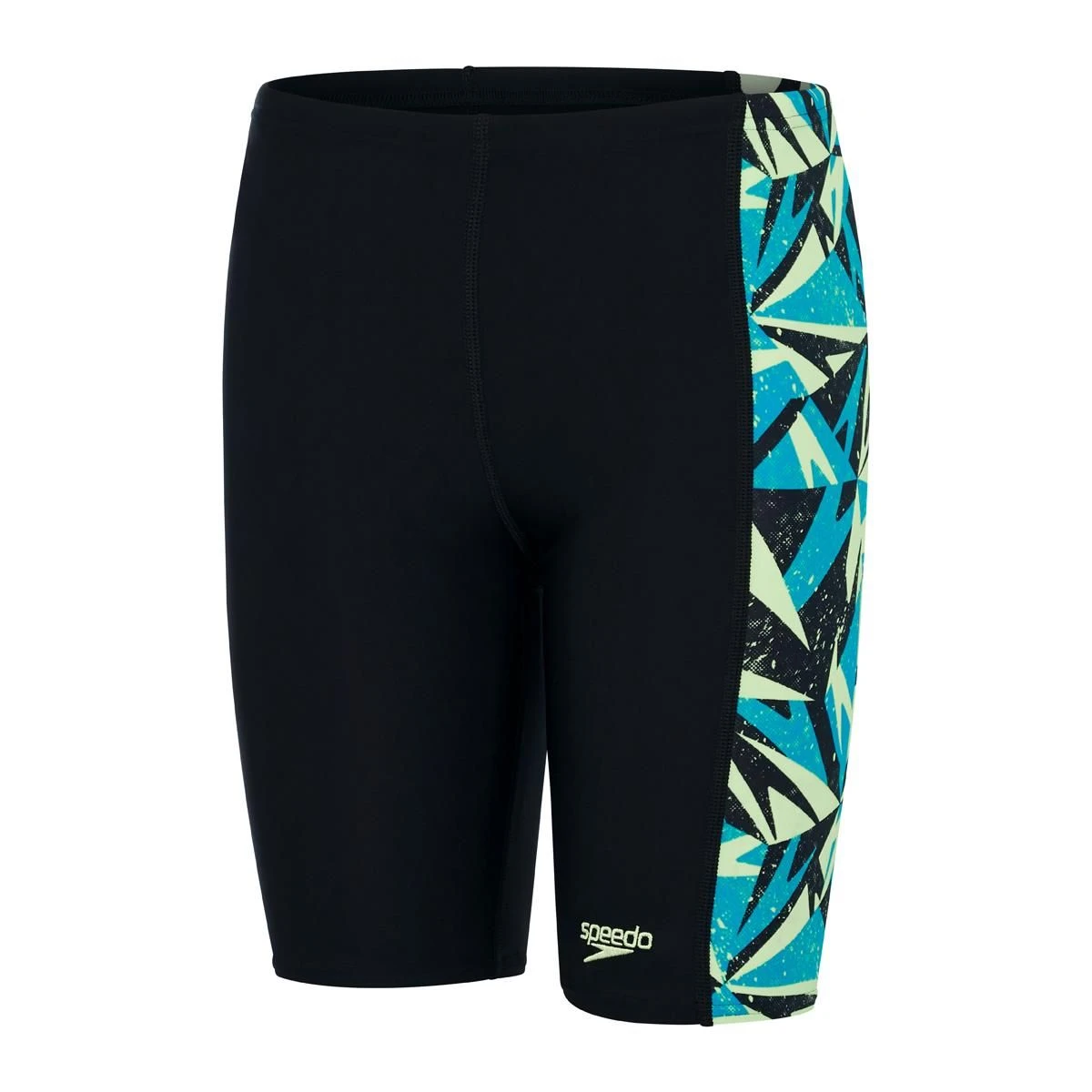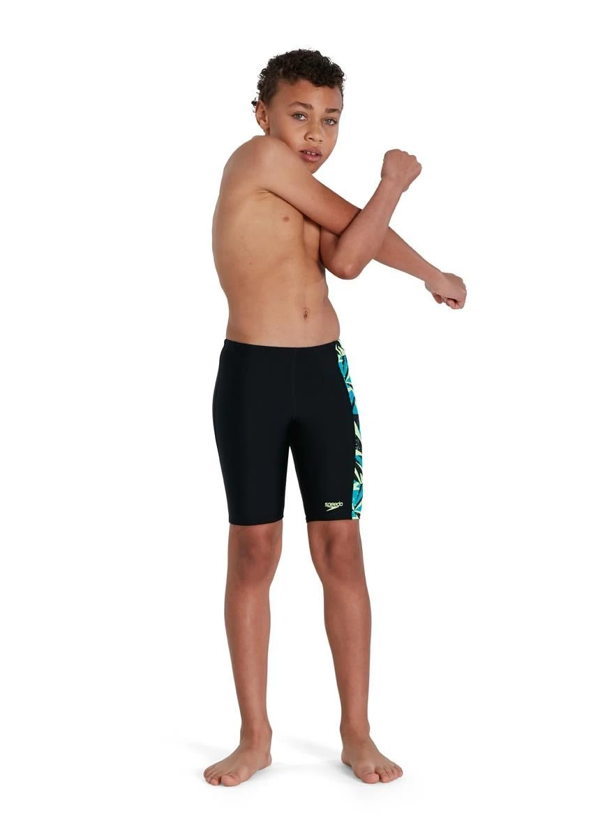 Celebrating the Speedo brand, this boys sporty black swimming Jammer features a side panel of with a ‘shattered’ Boom logo print in vivid shades of blue and green.