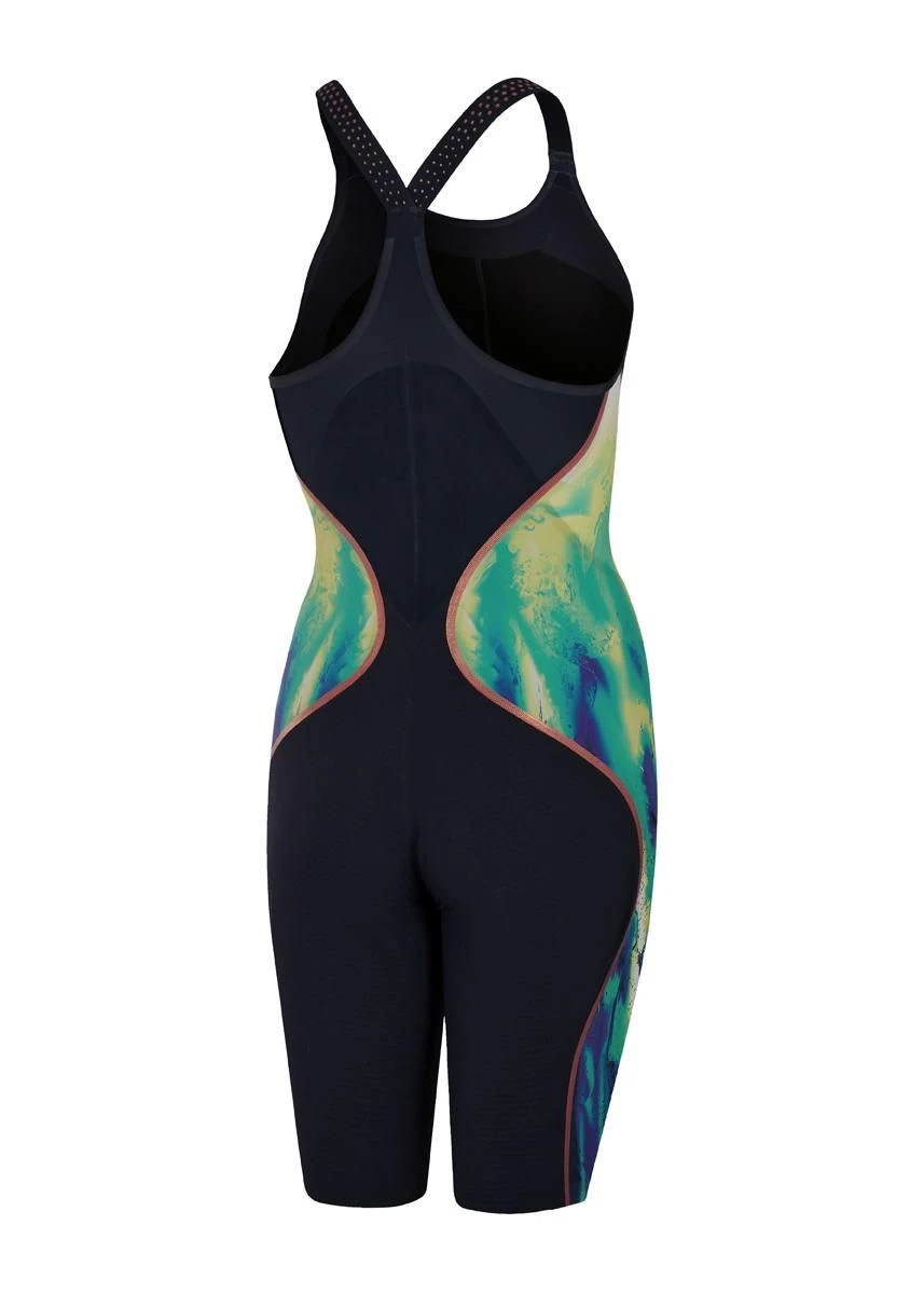 The Speedo Fastskin LZR Pure Intent Openback Kneeskin in Cosmic Storm features compressive dual layers and ergonomic seam construction designed to connect key muscle groups for greater power return.