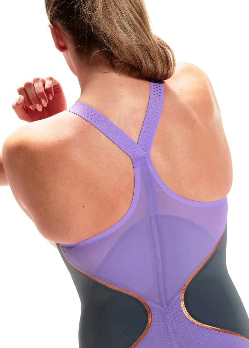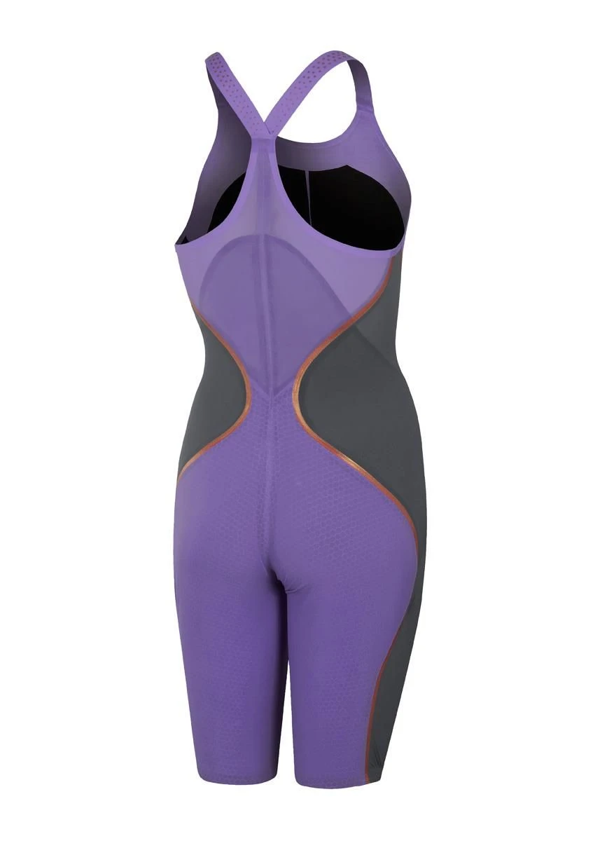 The Speedo Fastskin LZR Pure Intent Openback Kneeskin in Purple Reign features compressive dual layers and ergonomic seam construction designed to connect key muscle groups for greater power return.