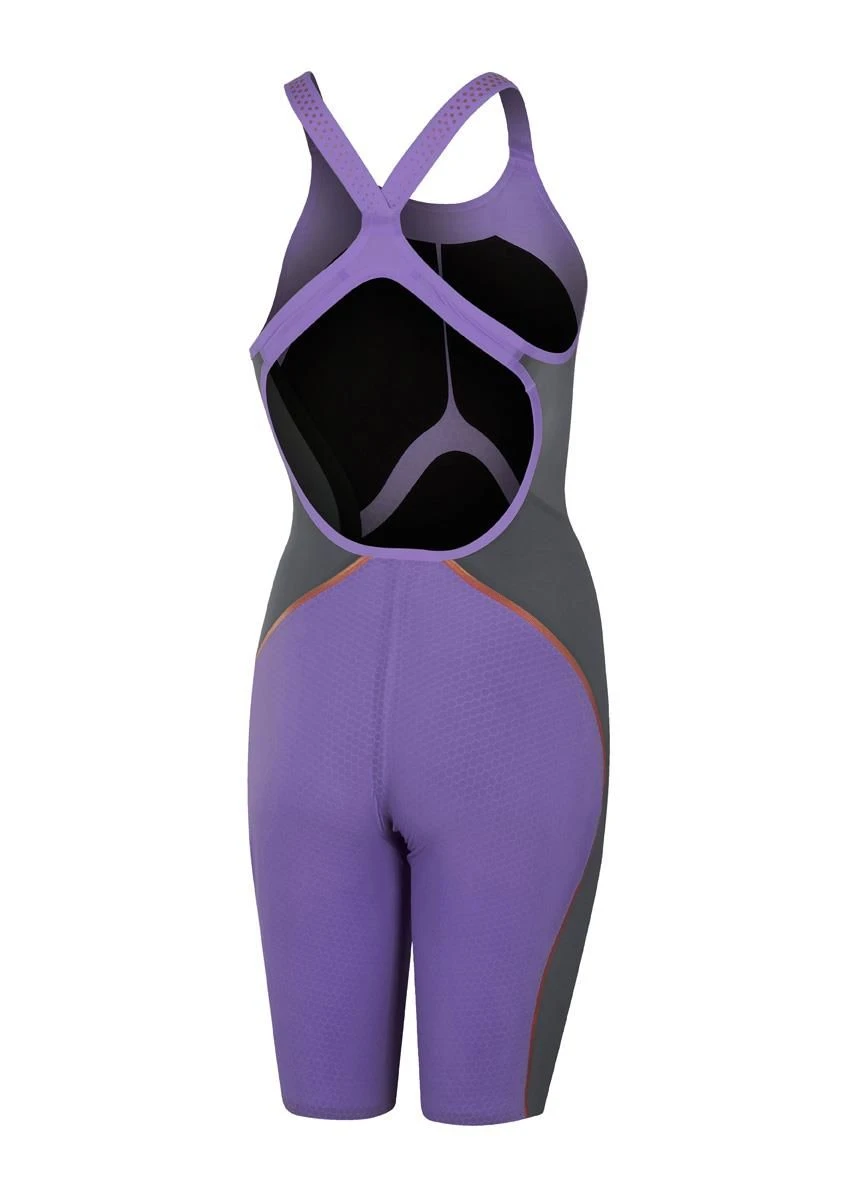 The Speedo Fastskin LZR Pure Intent Openback Kneeskin in Purple Reign features compressive dual layers and ergonomic seam construction designed to connect key muscle groups for greater power return.