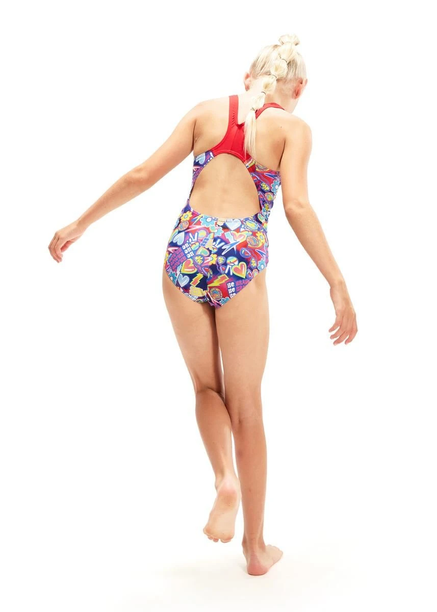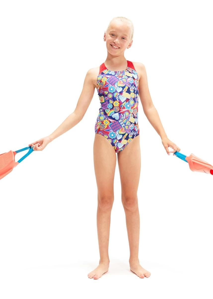 Radiate positivity in the pool wearing this colourful Splashback swimsuit, featuring a montage of love hearts, peace signs and uplifting statements. Perfect for swim lessons, the splashback straps are set away from the shoulders to increase freedom of movement, allowing young swimmers to move without feeling restricted. Made from Speedo durable ECO Endurance+ fabric, it’s quick-drying and 100% chlorine resistant. Plus, one of the yarns in this fabric is made from 100% post-consumer waste, such as recycled plastic bottles.