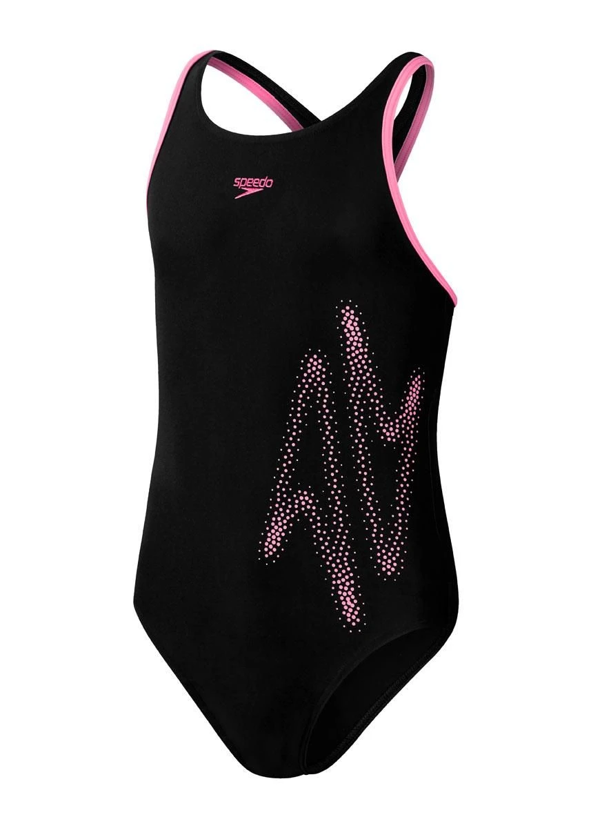 Iconic Speedo style. A celebration of Speedo branding, this sporty black swimsuit features a vertical Speedo Boom graphic in a spray-paint effect pink design. A modern twist on a Speedo classic, the Flyback design features skinny racerback straps which sit between the shoulder blades for an unrestrictive fit. Offering higher chlorine resistance than standard swimwear fabrics, the swimsuit provides excellent shape retention and fits like new for longer with CREORA® HighClo. If you’re looking for great eco-credentials, it’s got those, too: Speedo exclusive Eco EnduraFlex fabric is made from 100% recycled pre-consumer waste, such as recycled fabric waste from factories.