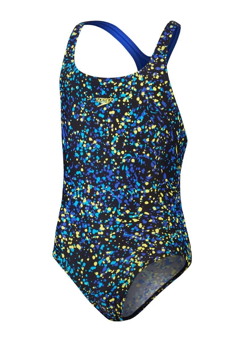 Take on training and lessons wearing this eye-catching Speedo girls Medalist swimsuit, which includes a vibrant blue and yellow splatter print.