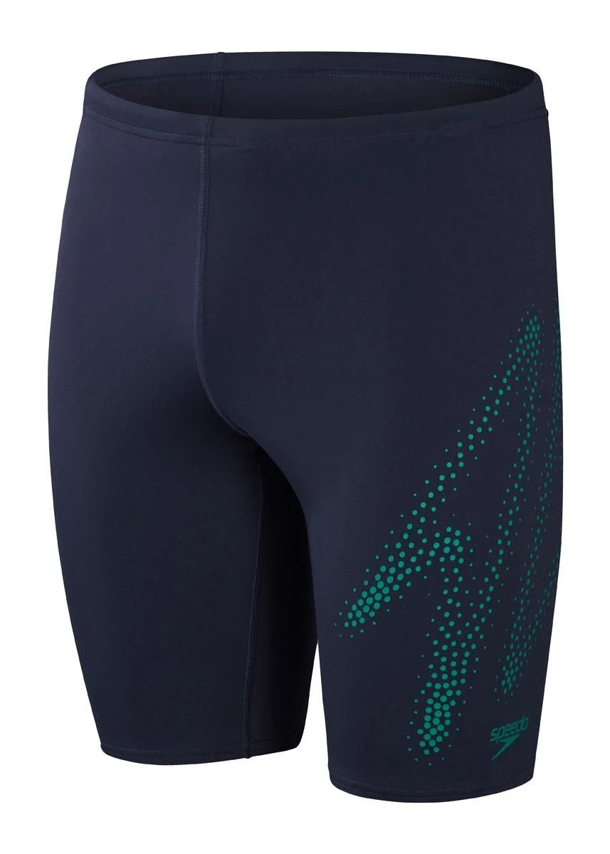 Dial up your swim style with this Speedo Boom Logo print. Streamlined in classic navy, the sporty Hyper Boom Jammer features a stylish spray-paint effect Speedo Boom graphic.