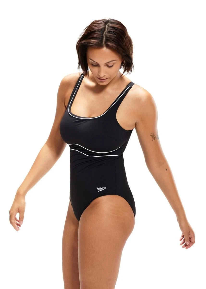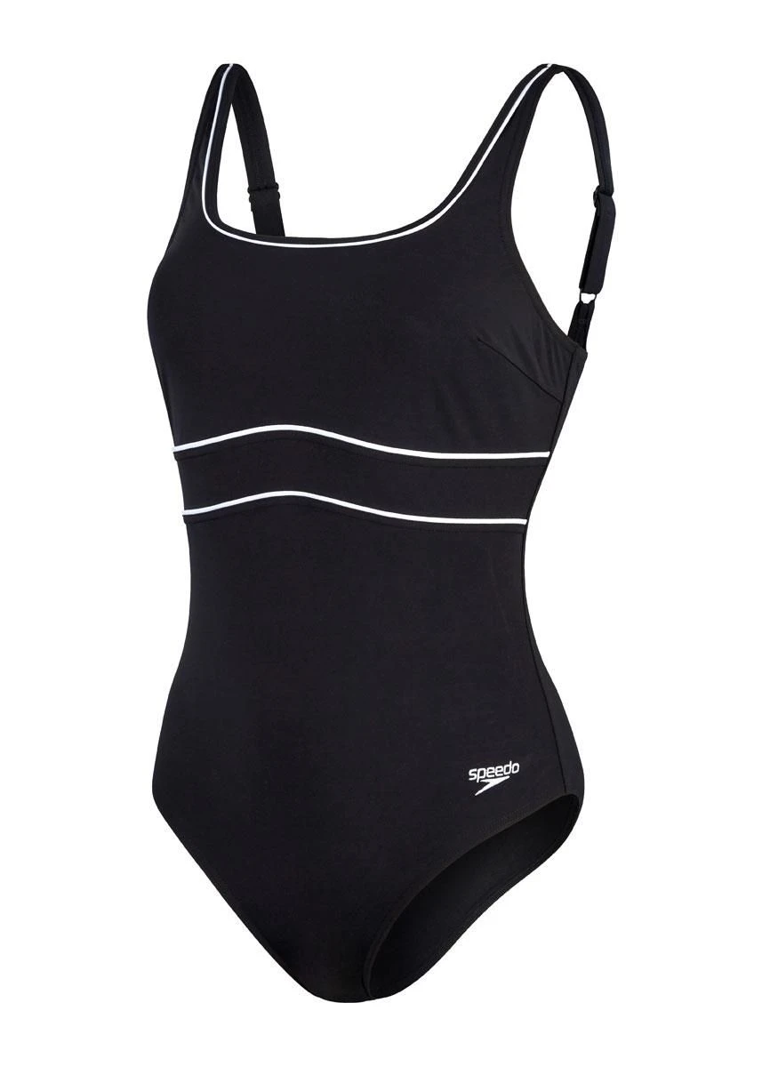 Enhances, flatters and feels good all over. The sporty-look black ContourEclipse swimsuit includes a square neckline and uses white underbust seaming to draw the eye upwards and flatter your shape. Adjustable straps ensure a great fit during your workout, whilst the shaping fabric and seaming supports and flatters the bust, offering medium bust support. Speedos soft new ECO SHAPE COMPREX fabric teams the best in shapewear innovation with the latest swimwear technology. Perfect for your regular workout, it includes LYCRA® XTRA LIFE™, which is ultra-chlorine-resistant and lasts twice as long as standard swimwear fabrics. ECO SHAPE COMPREX is made in part from recycled waste. The nylon yarn in the fabric is made from 100% pre-consumer waste, such as waste from factories.