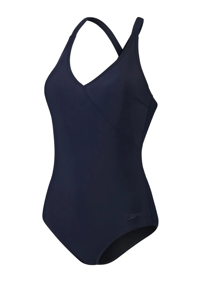 Speedos stunning Lexi swimsuit is timeless in navy and features a stylish crossover back and pretty wrap-style neckline.