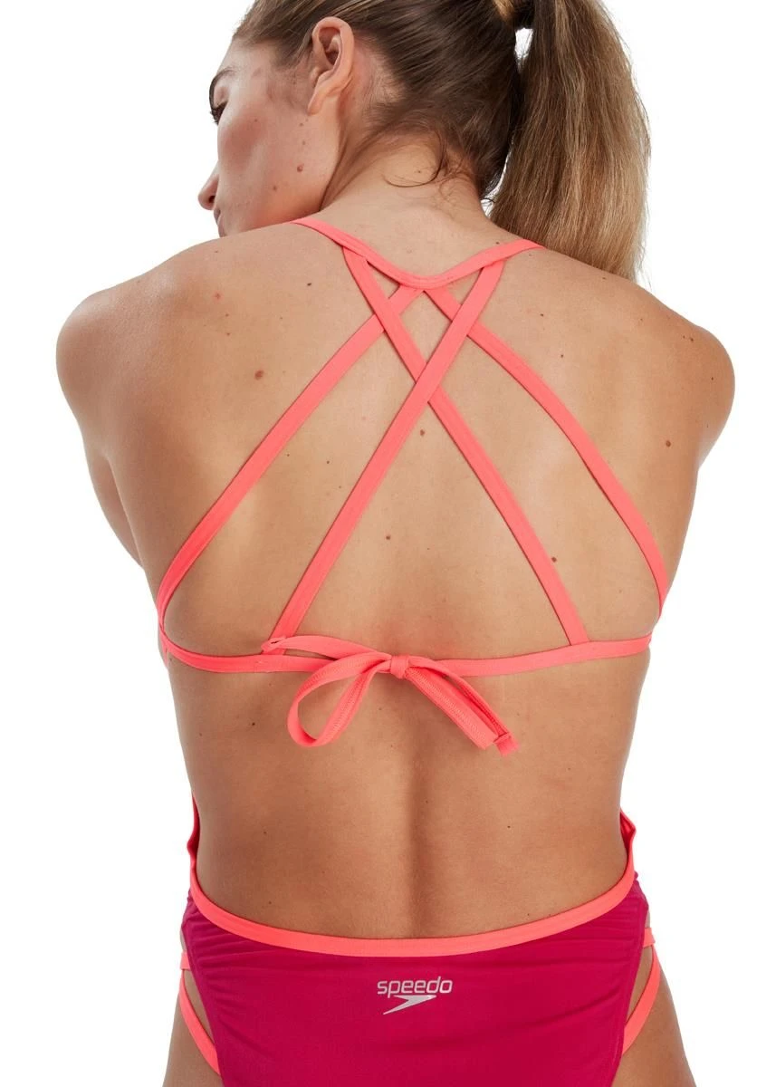 Speedo are all about the details with this stunning magenta Freestyler swimsuit, featuring an intricate tie-back strap and criss-cross hip detail.