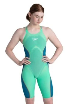 Feel unstoppable wearing Speedo’s latest innovation developed by swimmers for swimmers. The Fastskin LZR Pure Intent Closedback Kneeskin in Green Glow and Nordic Teal features compressive dual layers and ergonomic seam construction designed to connect key muscle groups for greater power return.