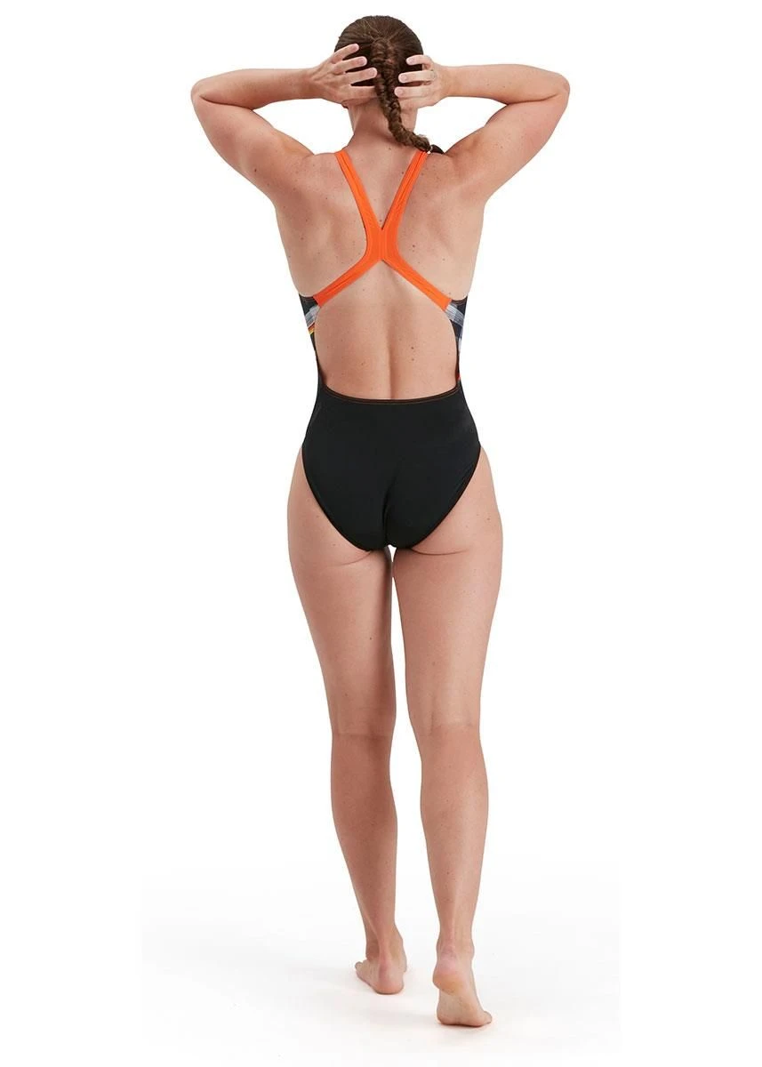 Make an impact in standout digital prints. Power through your training wearing this sleek Powerback swimsuit, featuring a warped digital print with distorted, glitch-effect graphics and contrasting orange straps. Ideal for drills and sets, the powerback style includes an open back and narrow straps to aid shoulder movement and flexibility on every stroke. Made to withstand daily swim sessions, our quickdrying and 100% chlorine resistant Endurance+ fabric helps colours stay bright for longer too.